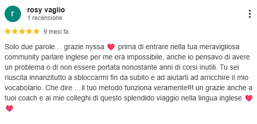 La parte più importante e innovativa è il fatto che questo sistema è stato TOTALMENTE CREATO DA ME che ero bloccata nel parlare inglese fino ai 45 anni. Avendo sbloccato il mio inglese e quello di mio figlio solo pochi anni fa ho creato un programma che risponde perfettamente alle tue esigenze e ai tuoi dubbi.